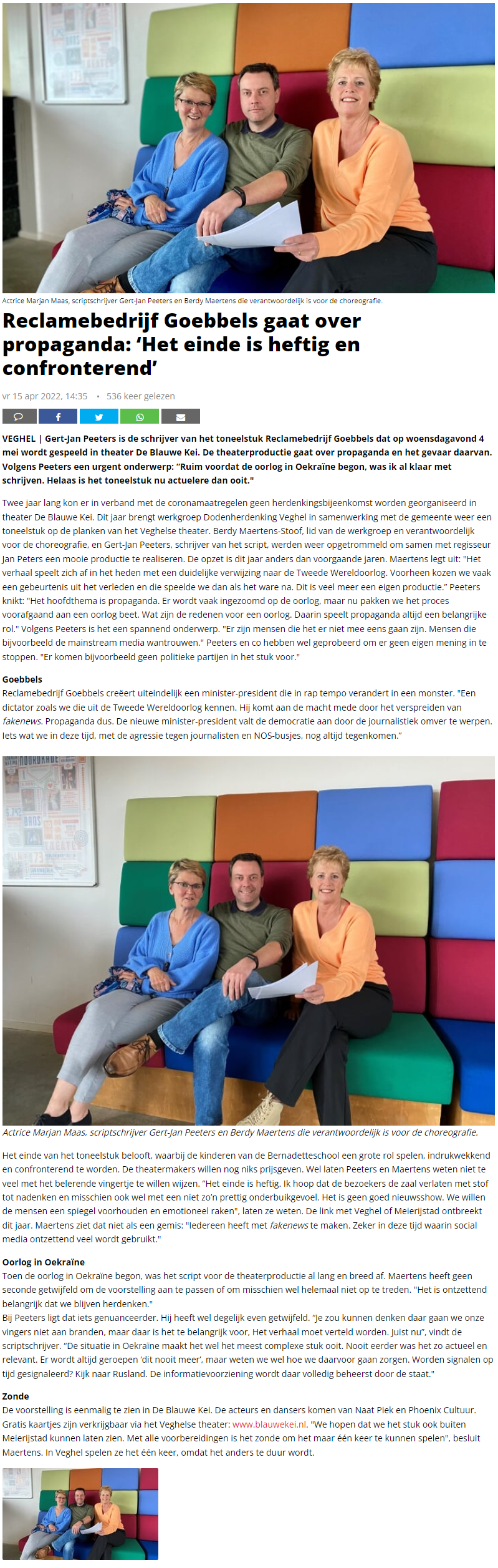 Op 4 mei speelt eenmalig in Theater de Blauwe Kei in Veghel het toneelstuk genaamd “Reclamebedrijf Goebbels”. Het is een kort verhaaltje van drie kwartier over een man die minister President van Nederland wil worden. De personeelsleden van ‘Reclamebedrijf Goebbels’ leren hem in sneltrein alles over propaganda. Hij leert hoe hij de Nederlandse kiezers kan manipuleren om op hem te stemmen. Het gaat zelfs een stap verder; ‘hoe voorkom je dat de nieuwe generatie jou van je troon gaat stoten?’